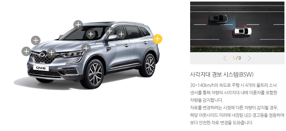 이번 QM6에는 다양한 안전사양들이 포함되어 있습니다. 트림별로 다소 차이는 있지만, 전체적인 내용을 하단을 통해 참고 해주시기 바랍니다.