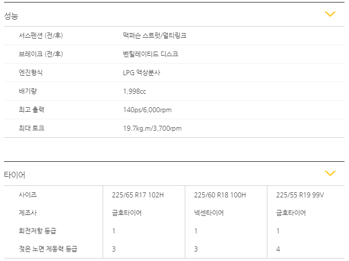 그 외에 성능과 타이어 정보 입니다. 필요하신 부분 확인 하시기 바랍니다.