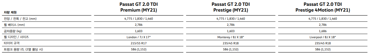파사트 GT는 총 3가지 트림으로 분류 됩니다. 2.0 TDI Premium, 2.0 TDI Prestige, 2.0 TDI Prestige 4Motion 입니다.