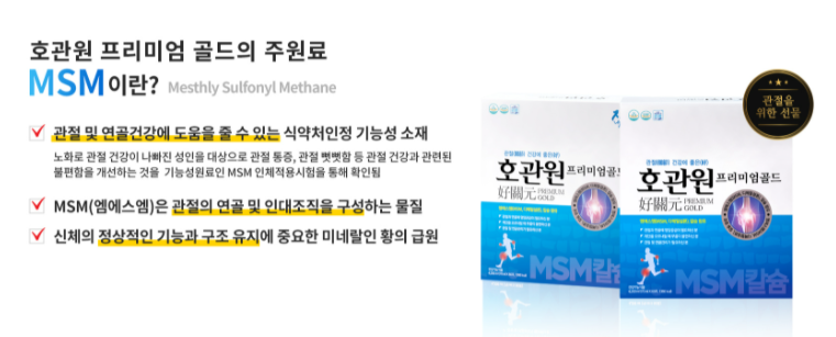 호관원 프리미엄 골드가 왜 좋은가 봤더니 식약처에서 인증하는 기능성 원재료인 MSM을 주원료로 하고 있어요. MSM은 관절 및 연골건강에 도움을 줄 수 있다고 인증 받은 소재거든요.