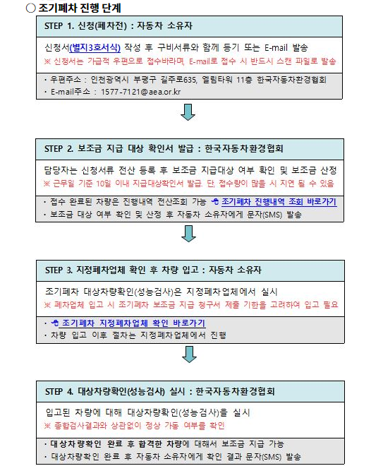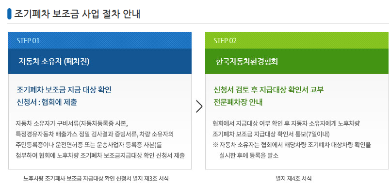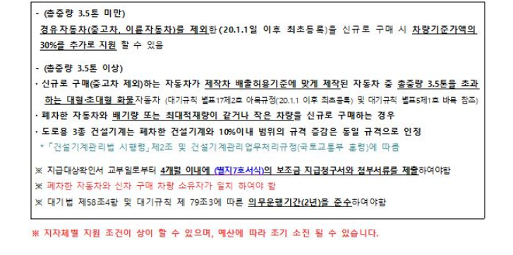 *단, 기본 지원금과 추가금액의 합은 상한액을 초과할 수 없고, 노후차량 조기폐차 지급대상확인서 발급 이후에 신규 등록한 차량이여야 합니다.