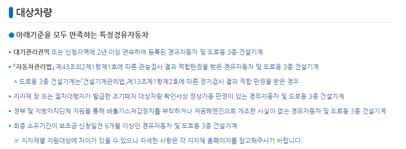 다음은 어떤차량이 노후 경유차 폐차지원금 대상인지 자세히 알아보도록 하겠습니다. 해당 부분을 자세히 보시면 자신의 해당하는 차량이 명확해지니 잘 확인해 보시기 바랍니다.