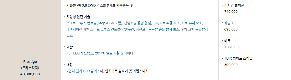 위의 표에서 보이듯이 프레스티지 기본 가격은 40,300,000원으로 시작하여 옵션에 따라 금액이 상향 됩니다. 익스클루시브와의 차이점에 대해서 확인 해보록 하겠습니다. 더 많은 데이터는 하단의 사이트에서 확인 가능 합니다.