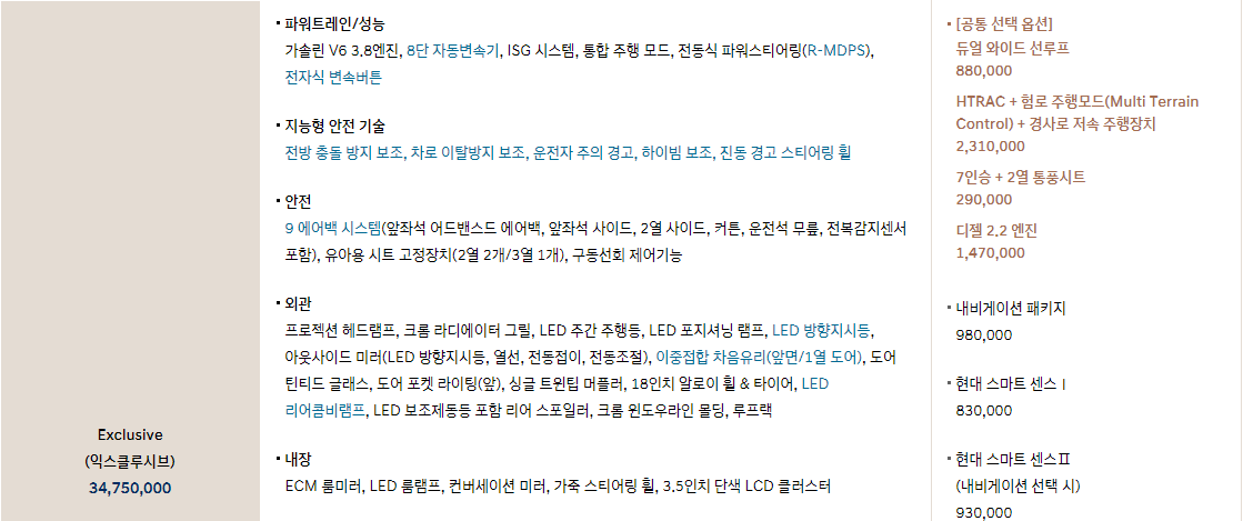익스클루시브와 가격차이는 약 5,550,000원 차이가 납니다.