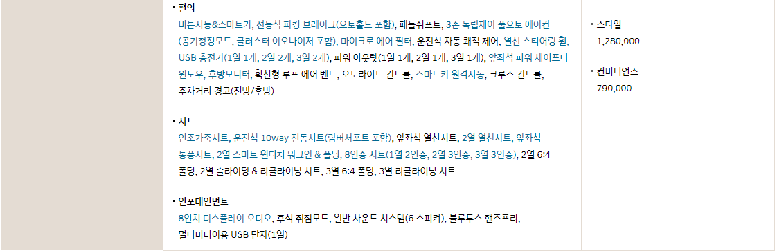 선택 하시는 옵션에 따라서 가격이 변동됩니다. 특히 패밀리카인 만큼 안전적 측면에서 9 에어백 시스템과 유아용 시트 고정장치가 옵션으로 들어가 있는걸 확인 할 수 있습니다.
