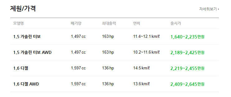 주요재원을 살펴보면 구동방식에 따라서 가격표가 변동 되는 것을 확인할 수 있습니다. 4륜구동을 원하신다면 가격이 좀 더 올라가는 것을 감안하셔야 합니다. 하지만 위에서 보셨듯이 자세한 옵션들에 따라 가격이 차이가 나니 필요하신 옵션등 신중하게 체크를 해보시기 바랍니다.