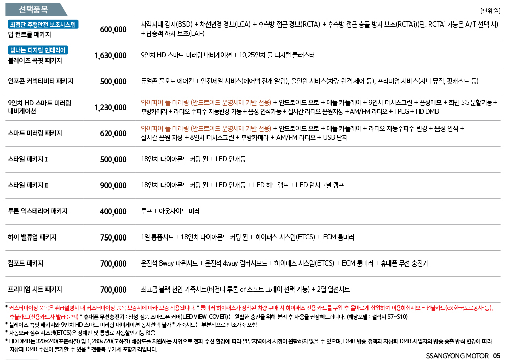 다음은 선택품목에 대한 가격을 알려드리겠습니다. 개인적으로 블레이즈 곡핏 패키지를 좋아하는데, 9인치 HD 스마트 미러링 내비게이션 + 10.25인치 풀 디지털 장치라서 꽤 유용하며 인테리어로 멋이 납니다.