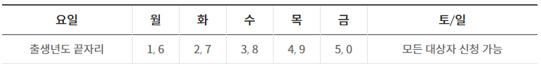 원활한 신청접수를 위해 출생년도 끝자리로 요일제를 적용합니다.