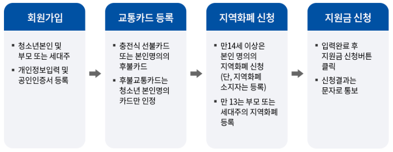 경기도 청소년 교통비 지원 방법 중 신청절차는 하단의 이미지와 같습니다. 회원가입은 청소년본인과 부모님도 가능하니 부모님께서 직접 신청이 가능하다는 점 참고하시기 바랍니다.
