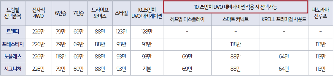 선택품목에 대한 세부안내표 입니다. 각 등급별로 분류가 되어 있으니 원하시는 등급과 트림에 대해서 비교 해보시면 편리 합니다.