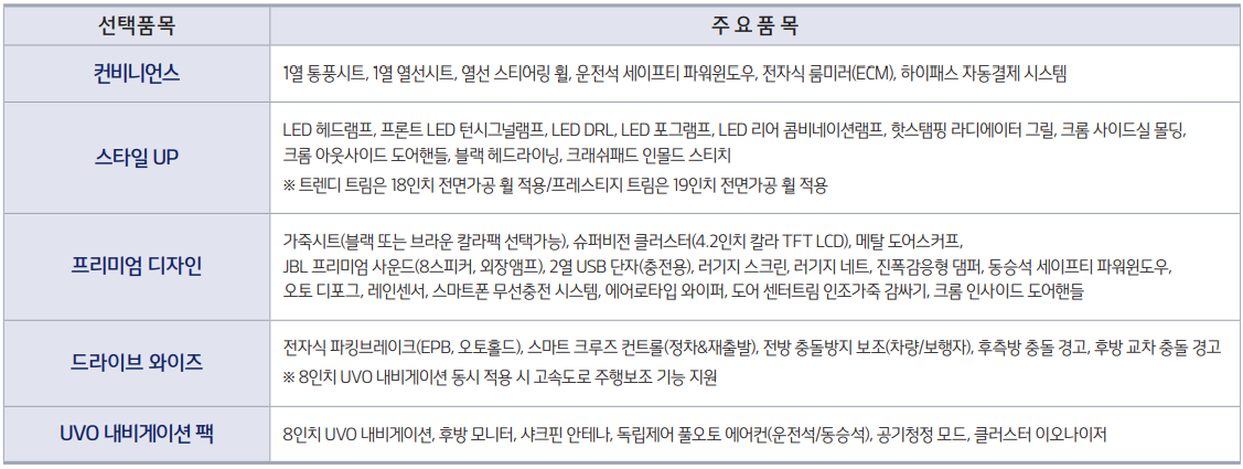 다양한 선택품목 중 개인적으로 추천 드리는 품목은 드라이브 와이즈 입니다. 해당 품목은 후측방 충돌 경고, 스마트 크루즈 컨트롤 등 드라이브 및 후진, 주차 등에 유용한 기능이 포함되어 있습니다. 참고하시기 바랍니다.