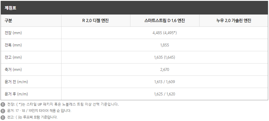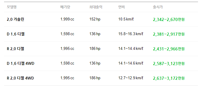 모델등급에 따라 가격차이는 나지만 쏘렌토와 비교해 보면 1000만원 정도 차이가 납니다. 가솔린의 경우는 등급이 한가지 이며, 출시가는 약 2300~2700만원 입니다. 다음은 제원을 알아보도록 하겠습니다.
