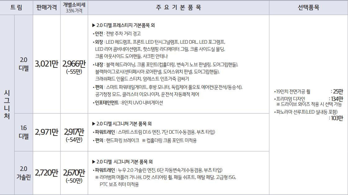 시그니처 등급 중 2.0디젤은 3,021만원 입니다. 등급이 높을 수록 다 좋은것이 아닌 자신에게 필요한 옵션을 확인하시고 구매하시면 좋습니다. 다음은 선택품목에 대한 세부안내표를 알아보도록 하겠습니다.