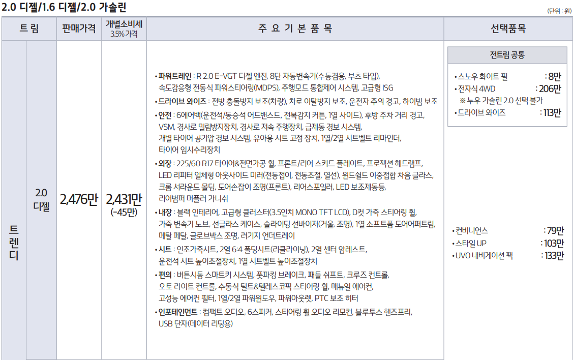 트렌디 등급은 가솔인이 없으며 프레스티지 부터 가솔린 구매가 가능합니다. 참고하시기 바랍니다. 개인적 의견으로 연료방식을 신경쓰시지 않는다면 프레스티지 등급의 2.0디젤을 추천 드립니다. 금액도 2,700만원으로 미만으로 가성비가 좋습니다.