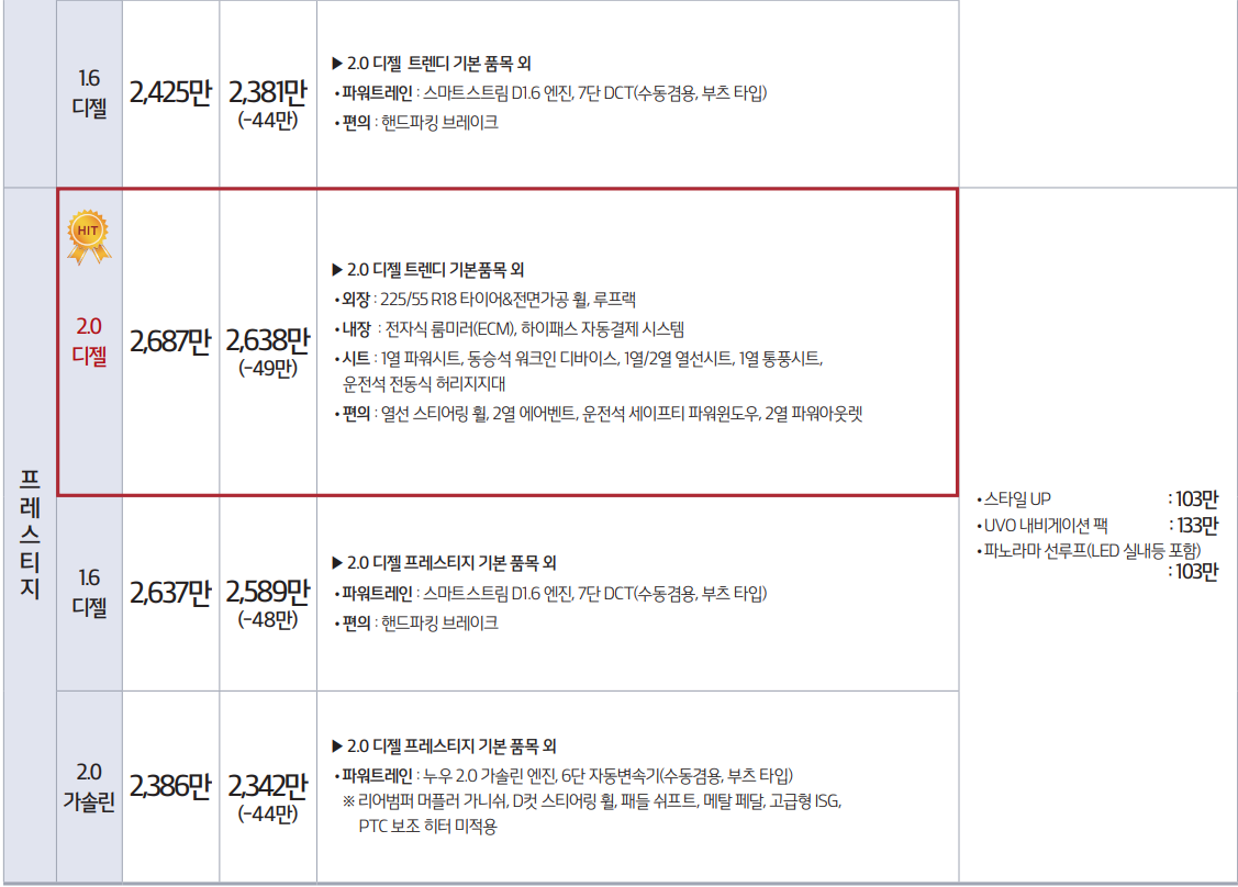트렌디, 프레스티지, 시그니처 3가지 등급으로 분류 됩니다. 현재 가장 많이 판매되고 있는 등급은 프레스티지 2.0 디젤 입니다. 가격은 2,687만원 입니다. 자세한 내용은 하단을 확인 해보시기 바랍니다.