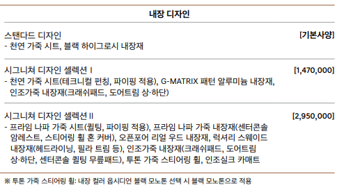 가솔린 2.5 엔진 모델 기준으로 보시면 됩니다. 하단의 표를 통해 자신이 선택하고자 하는 타입을 순서대로 고르시면서 기본모델의 가격에서 더하시면 견적이 바로 나옵니다. 참고해주세요.