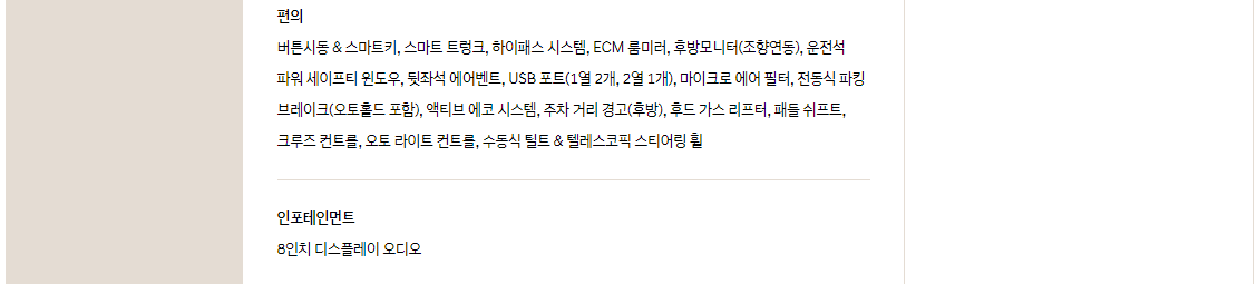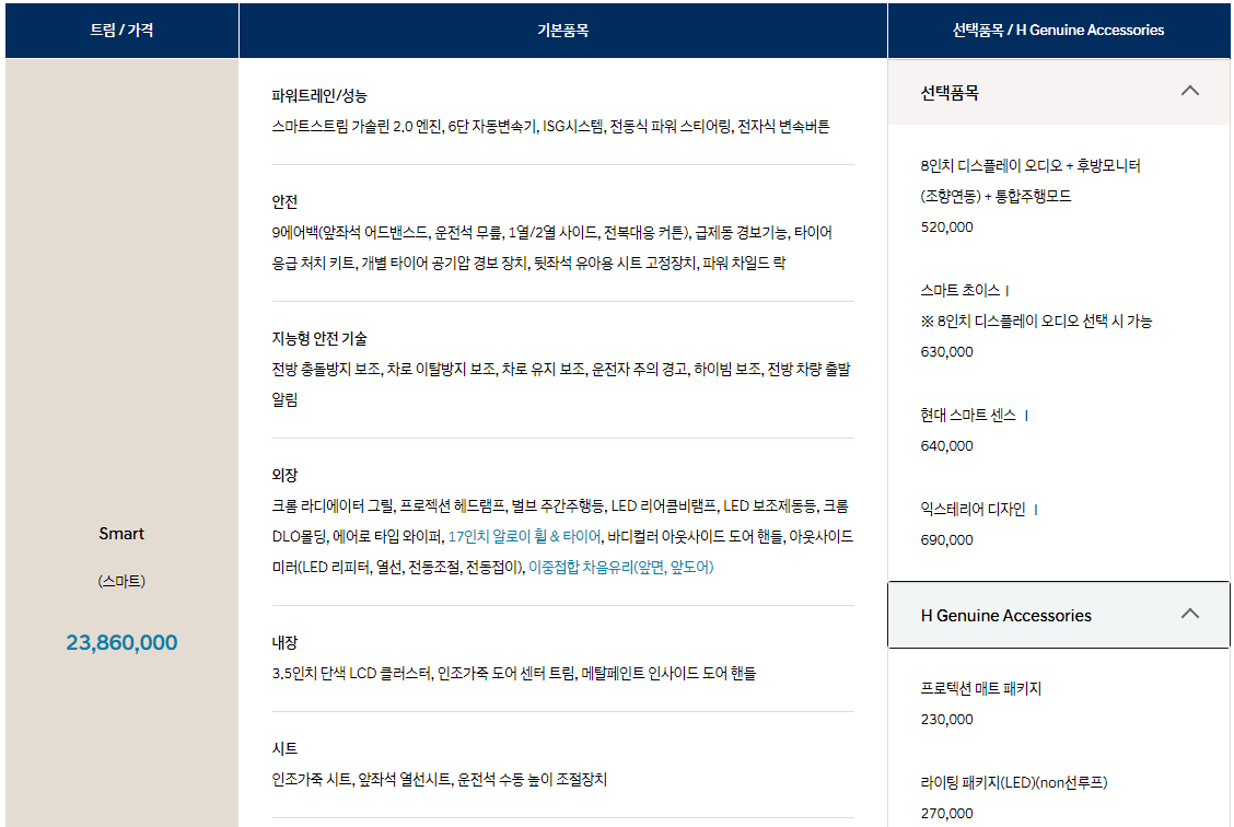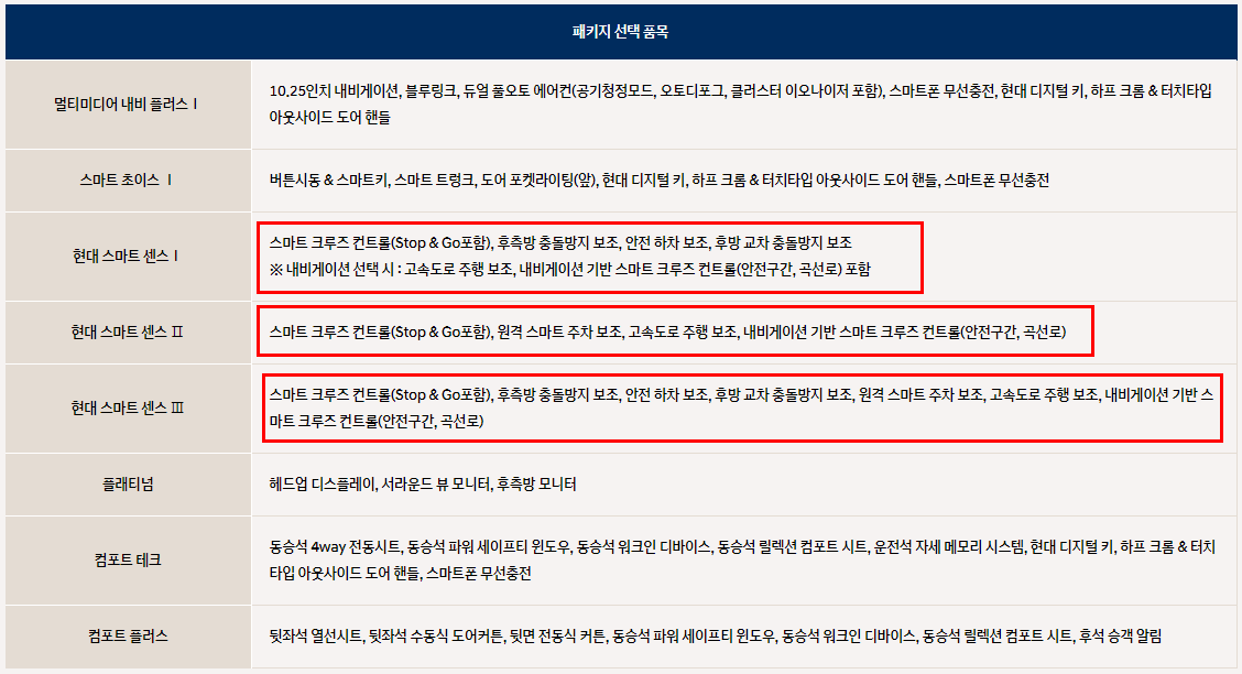 마지막으로 옵션을 선택하기 쉽게 현대자동차에서 제공하는 패키지 선택 품목에 대해서 알아보도록 하겠습니다.