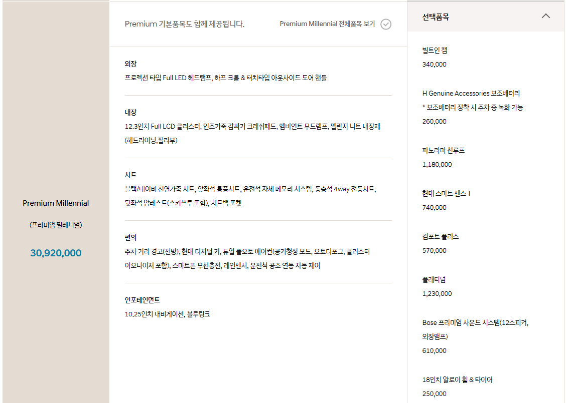 다음은 Smartstream L2.0 입니다. 위의 라인업과는 달리 프리미엄, 프리미엄 패밀리, 프리미엄 밀레니얼, 익스퍼레이션 으로 총 4가지 등급으로 분류 됩니다. 포함되는 기능과 옵션은 동일하지만 가격이 다르기 때문에 바로 확인해 보시기 바랍니다.