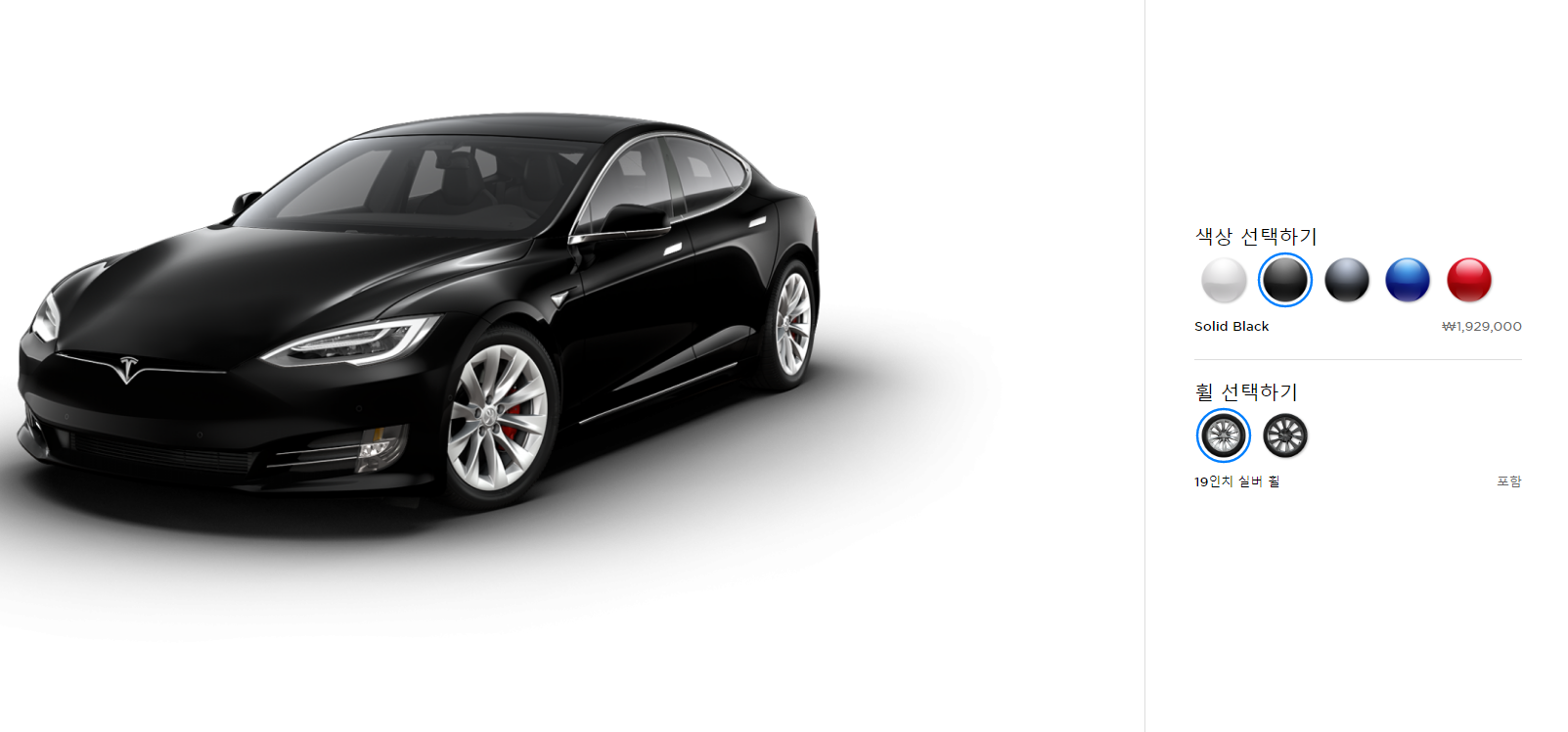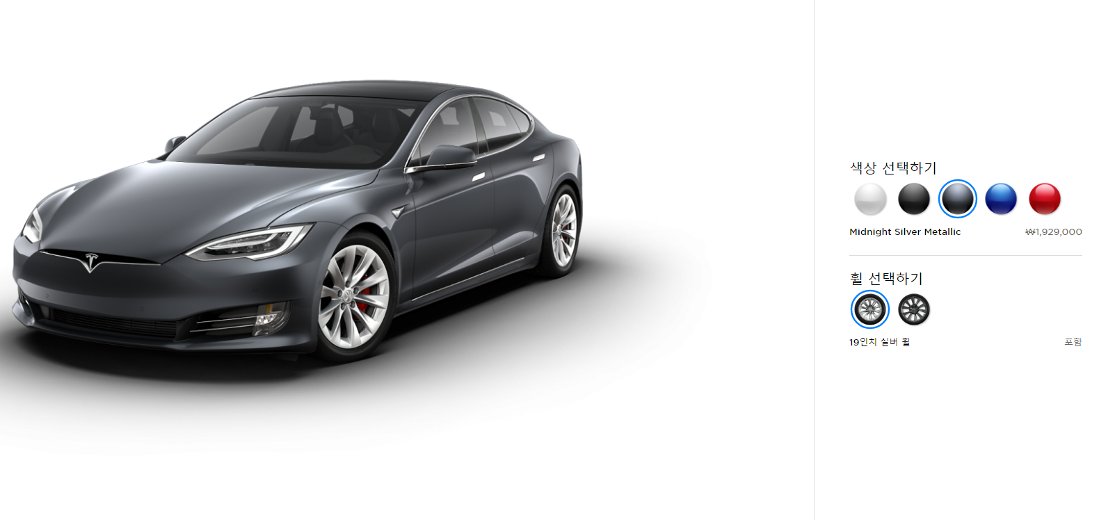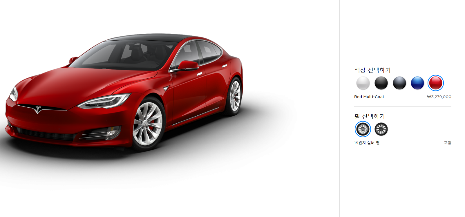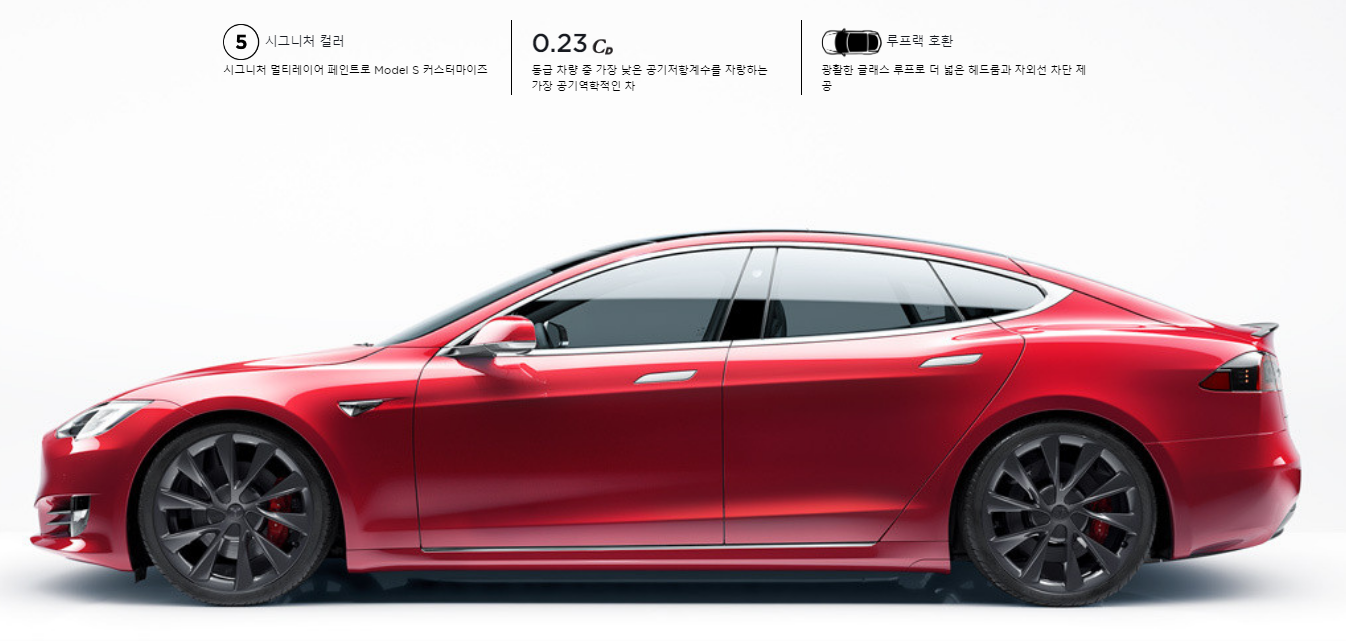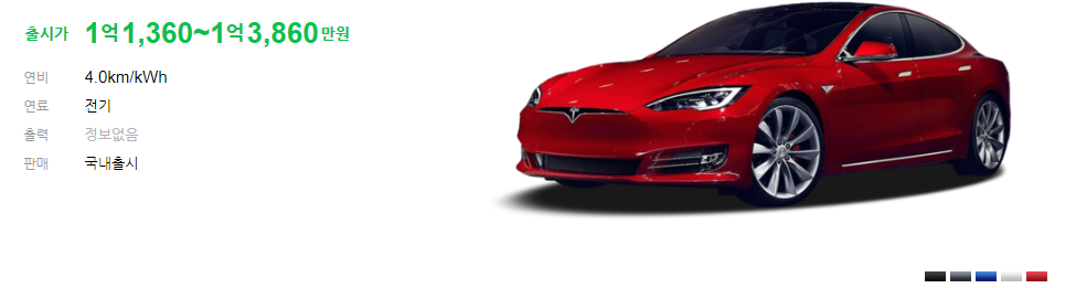 테슬라 모델S는 총 5가지 색상이 있습니다. 다만 기본 모델에서 다른 색상 선택시 비용이 추가 됩니다. 마지막의 레드 색상은 3,279,000원 추가 됩니다. 그 외에 다른 색상은 1,929,000원 추가 되는 점 참고 해주시기 바랍니다.