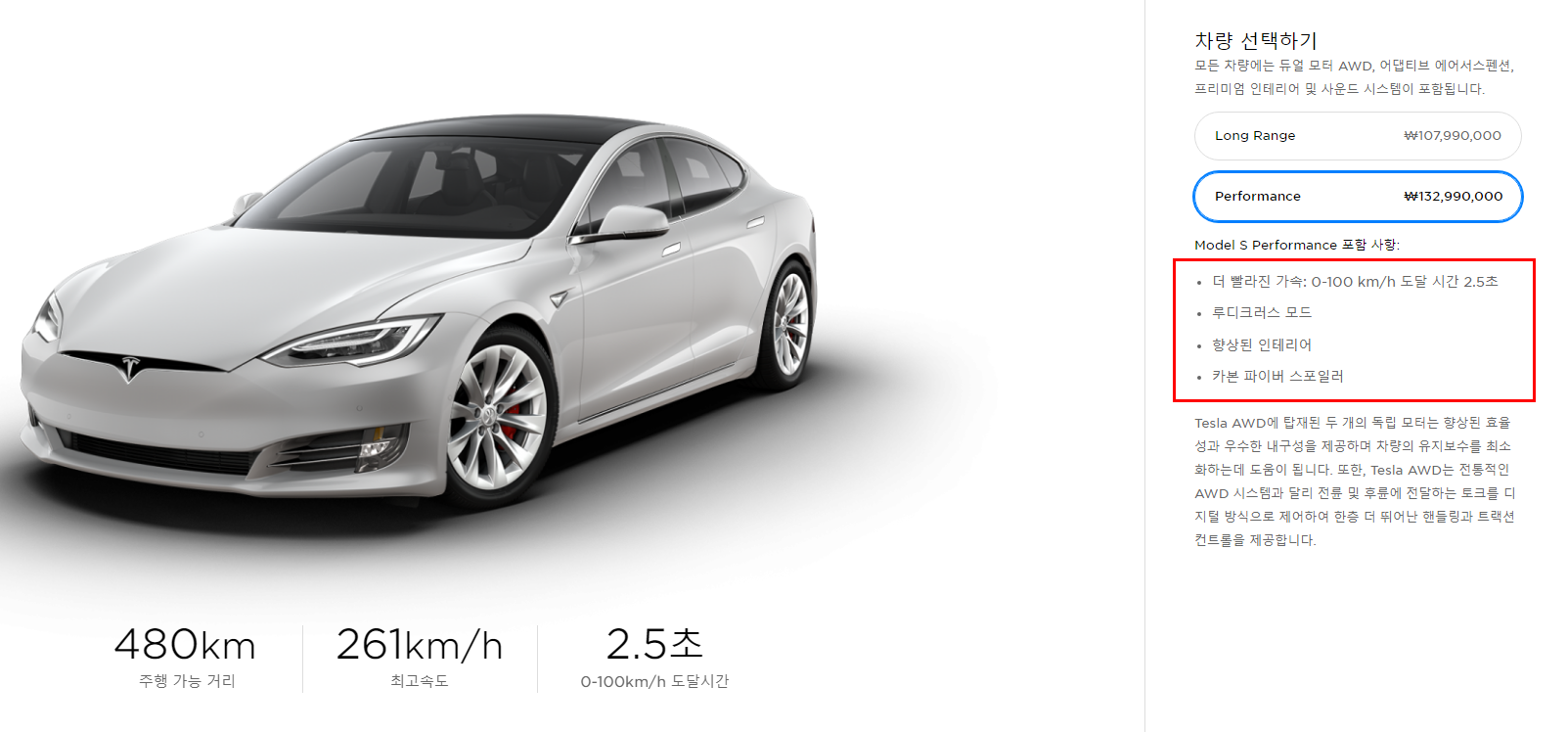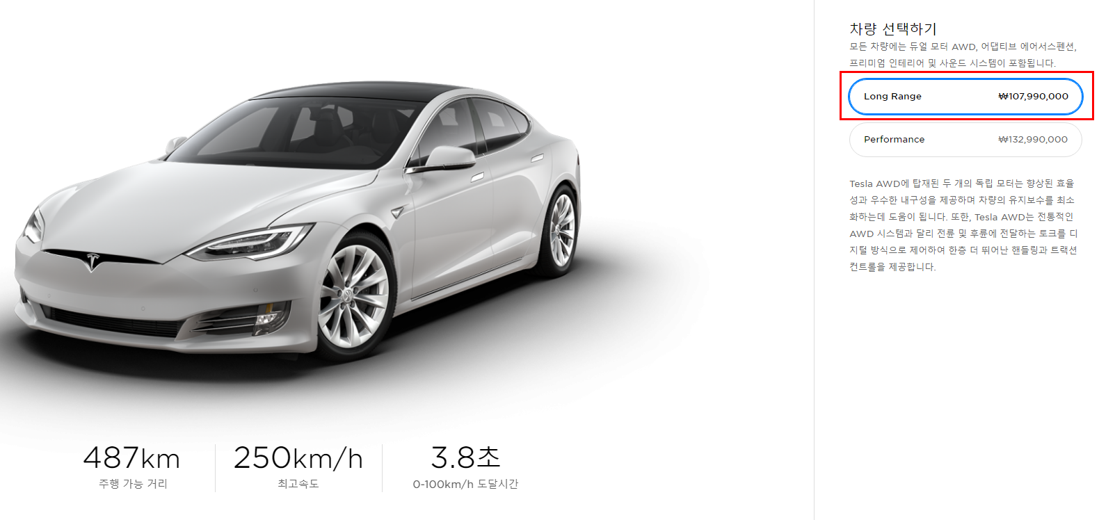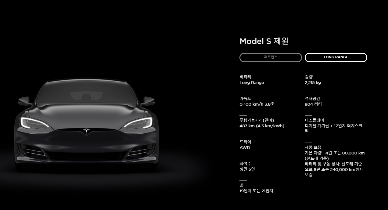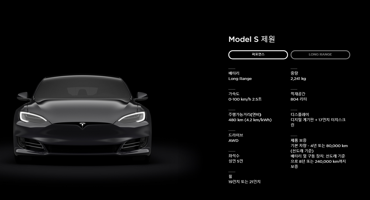 테슬라 모델 S 2가지 차량으로 나뉩니다. Long Rang 롱레인지와 Performance 퍼포먼스 입니다. 두 가의 차이점은 하단의 이미를 통해 알아보도록 하겠습니다. 해당 순서는 테슬라 홈페이지 차량 구매 순서와 동일 합니다.