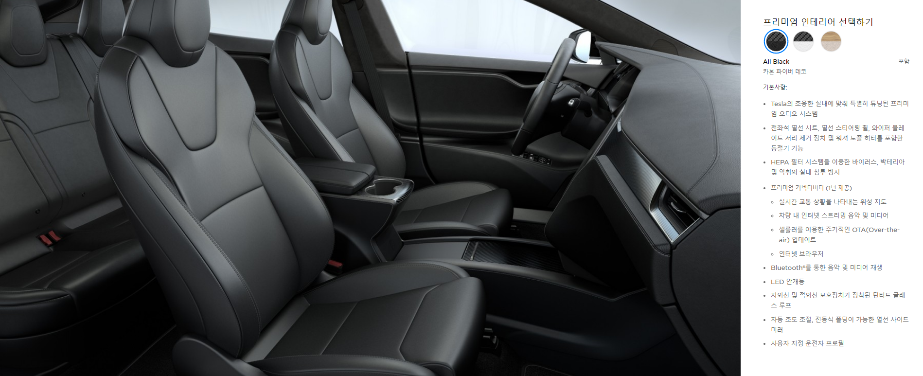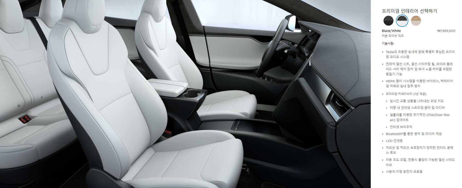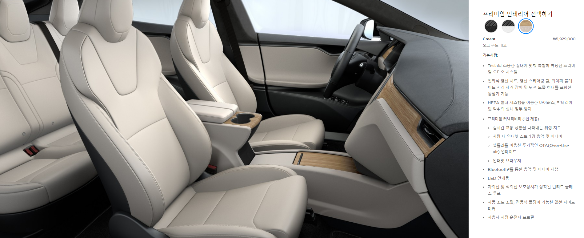 다음은 내부 인테리어 색상입니다. 가장 상단의 기본 색상과 포함 총 3가지 색상으로 변경이 가능 합니다. 내부 인테리어도 기본 옵션 외 다른 옵션 선택 시 1,929,000원이 추가 됩니다.