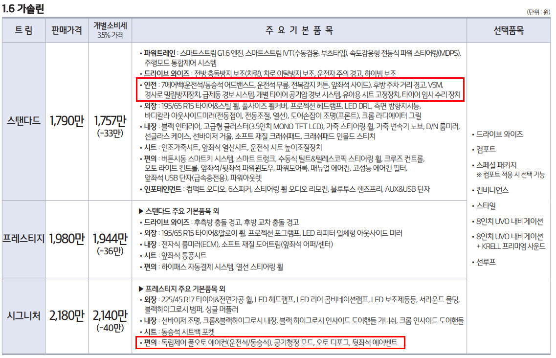 스탠다드의 경우 1,790만원으로 약 1,800만원입니다. 저는 개인적으로 주요기본품목을 볼때 안전기능을 많이 살피는 편입니다. 후방 주차 거리 경고, 급제동 경보 시스템 등 운전자의 운전을 편리하게 해주는 기능이 있는걸 볼 수 있습니다. 프레스티지는 1,980만원 이며 시그니처 트림은 2,180만원 입니다. 공기청정모드 및 풀 오토 에어컨이 포함되어 있는 것이 장점입니다.