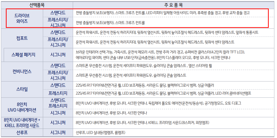 다음은 트림별 선택품목 안내표 입니다. 기본품목에서 원하시는 트림 선택 품목의 금액 더 하시면 출고가가 나옵니다. 각 품목에 대한 상세 내용은 하단에서 확인 해보도록 하겠습니다.