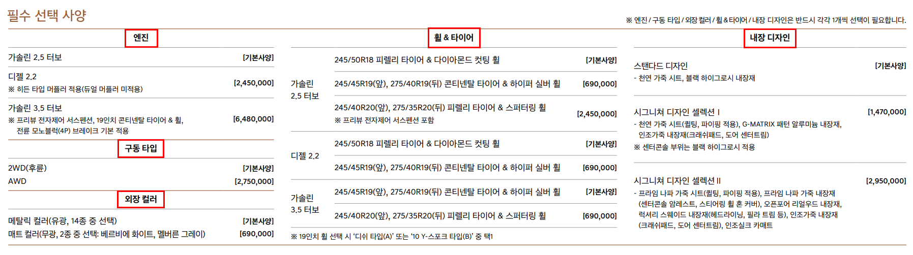 필수 선택 사양으로는 엔진, 구동타임, 외장 컬러, 휠&타이어, 내장 디자인입니다. 기본으로 선택하면 기본 모델에서 가격은 추가 되지 않습니다. 원하시는 차량의 스팩으로 선택하시고 기본 모델에 금액을 추가 하시면 됩니다.