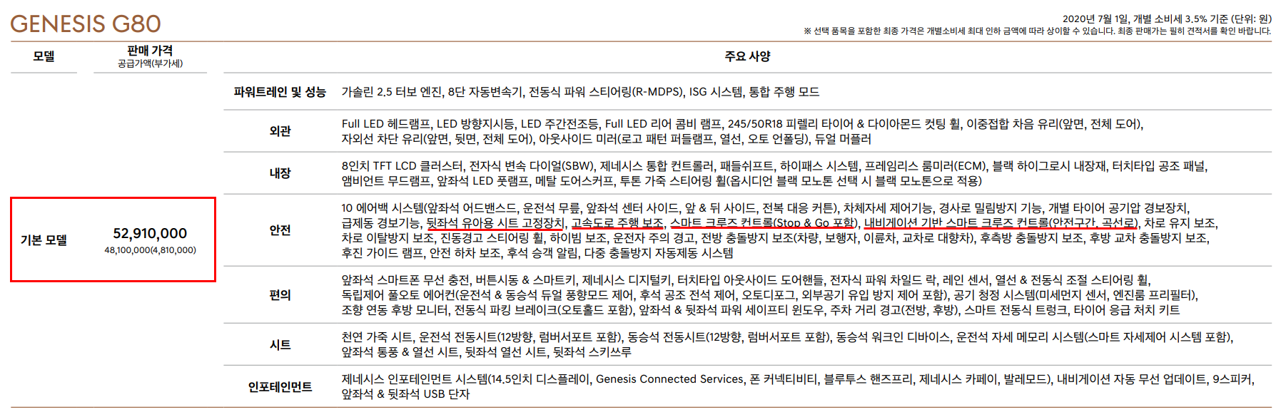 제네시스 구매 프로그램은 기본모델에세 엔진 및 구동 타입 등 필수 선택 사양을 선택 후 선택 품목을 선택하면 금액이 추가 되는 방식 입니다. 2021 G80 기본 모델의 가격은 52,910,000원 입니다. 기본 모델에 이미 다양한 안전 기능 및 인포테인먼트가 포함되어 있습니다.