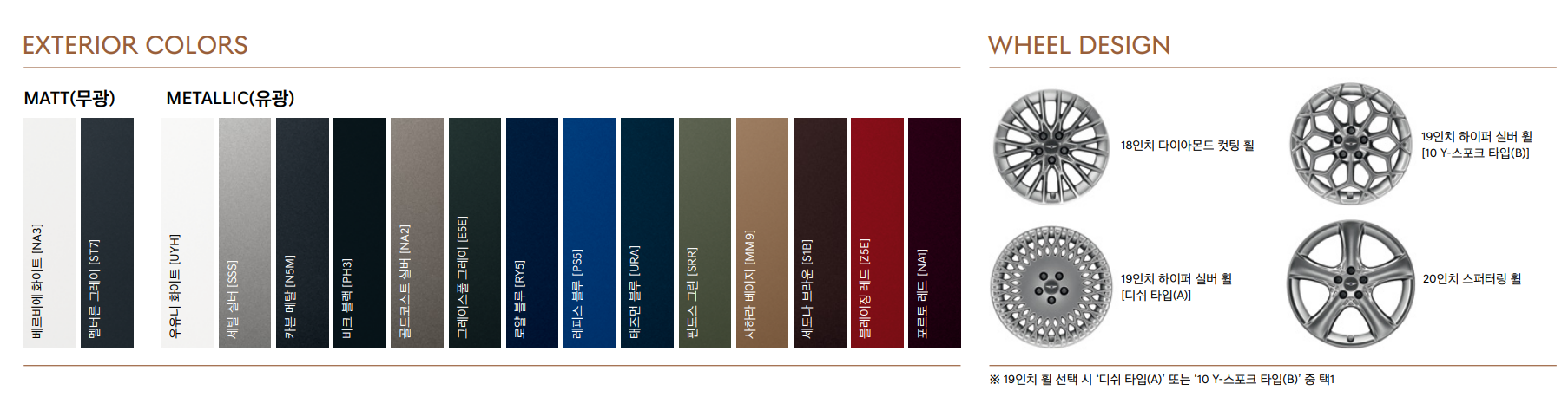 다음은 차량의 외장색상과 휠 입니다. 해당 옵션도 선택지에 따라 가격이 추가 됩니다. 위의 표에서 확인이 가능합니다.