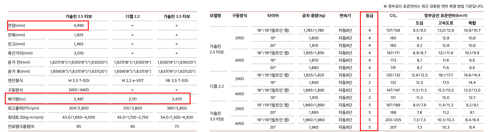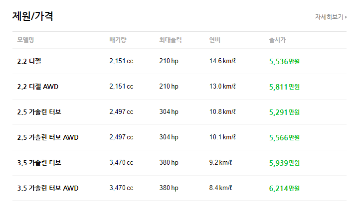 출시가는 5,291~6,214만원으로 옵션포함 트림 가격에 따라 약 1,000만원 차량 차이가 납니다. 연비는 8.4~14.6 으로 연료방식에 따라 꽤 많은 차이가 납니다. 연료방식은 디젤과 가솔린 2개 선택이 가능합니다.
