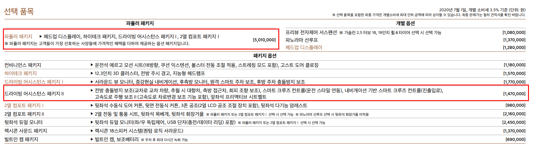 필수 선택 사양 선택을 하시고 옵션, 선택 품목을 선택하시면 됩니다. 여기서는 선택 사항이기 때문에 선택을 하지 않으면 위에서 선택한 필수 선택 사양까지가 총 차량의 가격이 됩니다. 선택 품목에서는 개인적으로 파퓰러 패키지와 운전자의 안전 및 드라이빙에 큰 도움을 주는 드라이빙 어시스턴스 패키지 2를 추천 합니다.