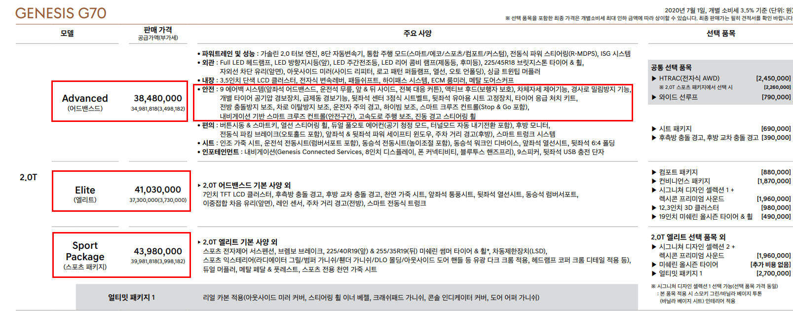 2020 제네시스 G70 트림은 2.0T, 2.2D, 3.3T스포츠에서 세부트림으로 어드밴스드, 엘리트, 스포츠패키지, 프레스티지 입니다. 하나하씩 순서대로 확인해 보도록 하겠습니다.