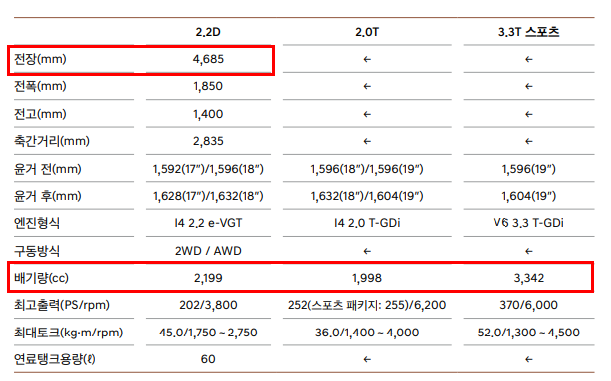 전장은 4,685mm 이며 내부 디자인이 굉장히 잘 나와 더 넓고 아늑한 느낌입니다. 배기량은 트림별로 2000cc~3300cc 까지 종류가 3가지 입니다. 다음은 제네시스 G70 트림/옵션별 상세 가격표 알아보도록 하겠습니다.