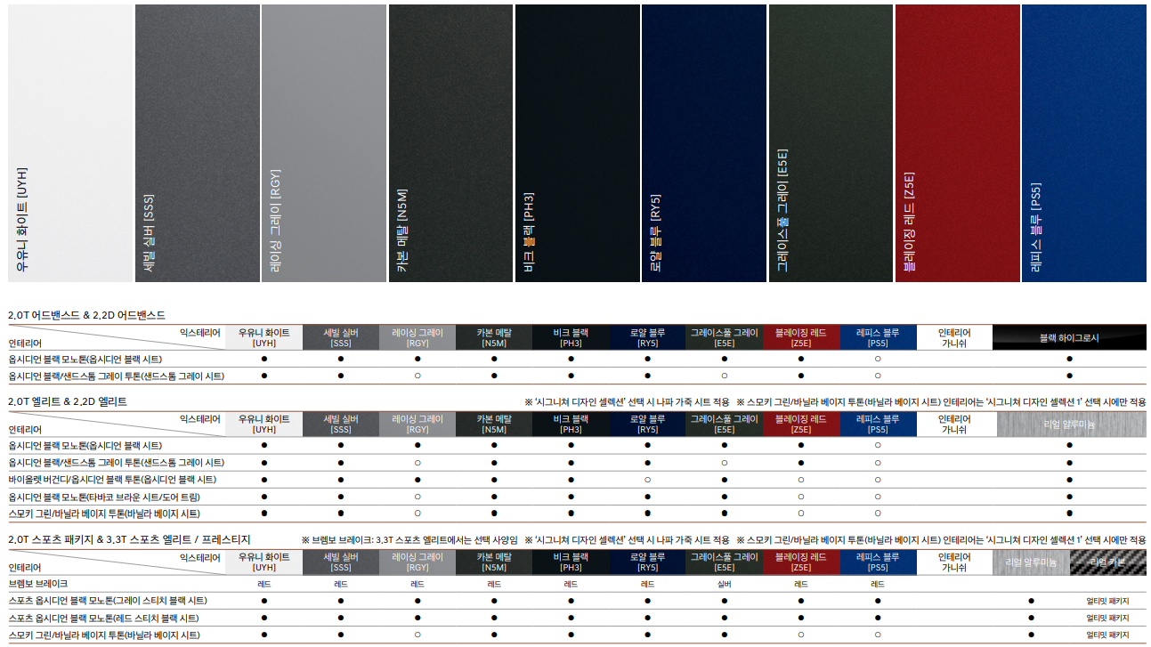 외부 인테리어는 총 9가지 색상으로 가능합니다. 다만, 트림별로 불가능한 색상이 있으니 위의 표를 참고하시어 미리 체크해보시기 바랍니다.