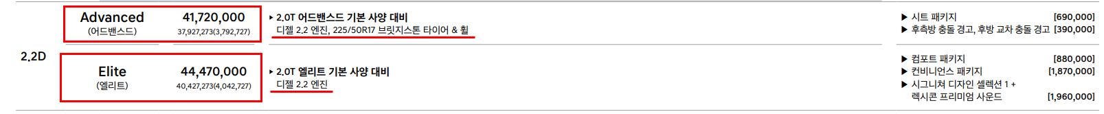 2.2D 트림은 스포츠 패키지는 빠져있으며 배기량이 2.0에서 2.2로 확장되고 가솔린에서 디젤로 변경된 트림입니다. 차량 가격은 어드밴스드 41,720,000원, 엘리트 44,470,000원 입니다.