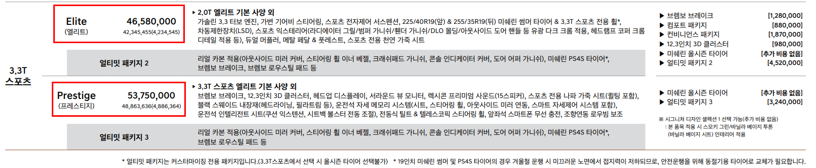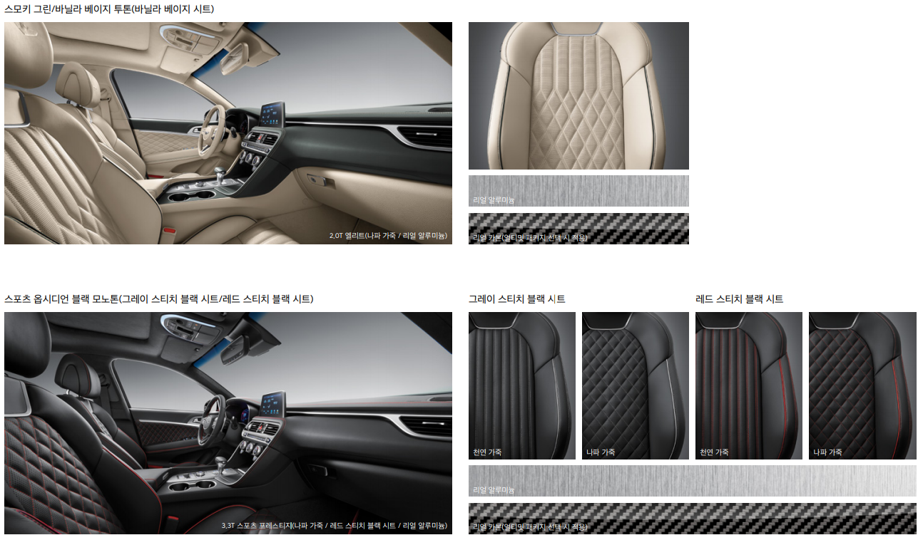 마지막으로 3.3T 스포츠 트림은 엘리트와 프레스티지로 분류 됩니다. 엘리트의 경우 2.0T 엘리트 기본사양을 기본으로 추가 옵션이 들어가있는 트림입니다. 프레스티지는 제네시스 G70중 가장 가격이 높은 트림으로 53,750,000원 입니다. 3.3T 스포츠 엘리트를 기본 사양으로 하고 추가적 기능이 들어가있습니다.