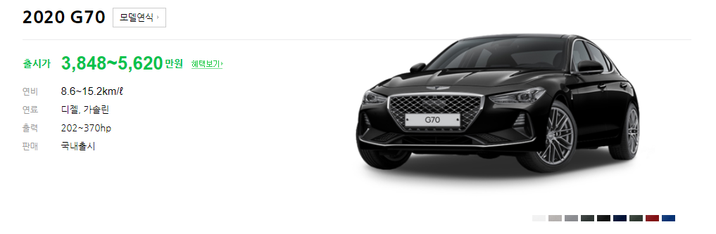2020 제네시스 G70은 중형치고 굉장히 세련된 디자인과 크기 그리고 괜찮은 가격으로 출시가 되었습니다. 우선 세부 옵션 확인 전 출시가는 3,848 ~ 5,620만원 으로 옵션 및 연료방식 등에 따라 약 1,500만원 가량의 차이가 납니다. 연료방식은 디젤과 가솔린 방식 입니다. 연비는 8.6~15.2로 어떤 트림을 선택하느냐에 따라 달라집니다.