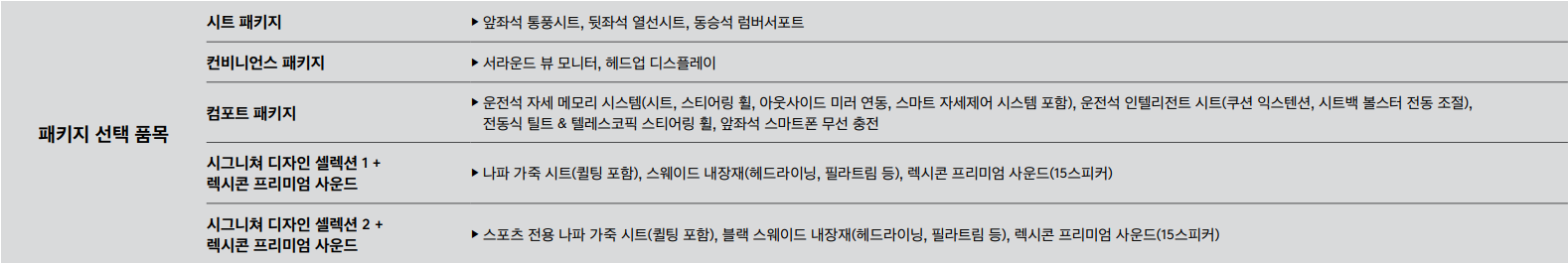 패키지 선택 품목은 위와 같습니다. 원하시는 패키지를 선택하시면 동일 트림에 더 좋은 차량으로 업그레이드가 가능합니다. 개인적으로 컴포트 패키지가 운전자 안전과 드리이빙 편리를 위해 좋아 추천드립니다.