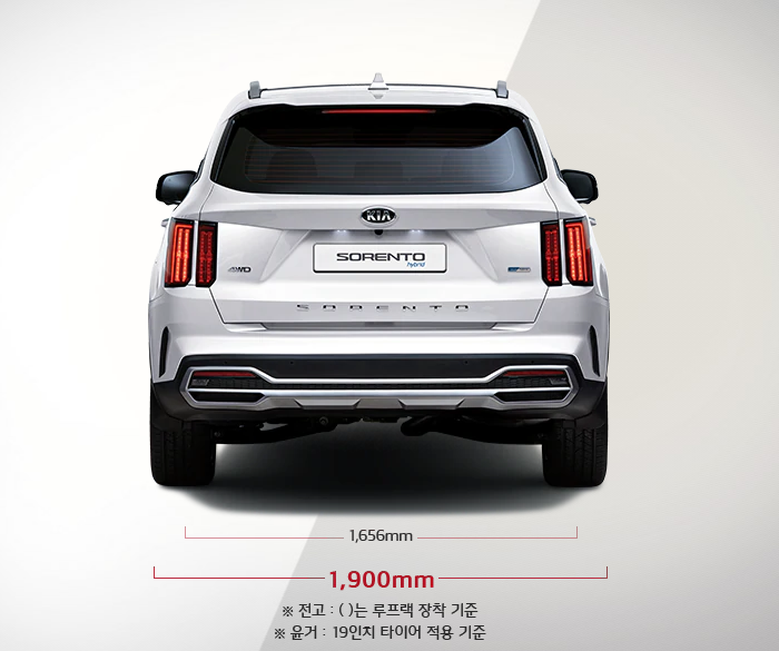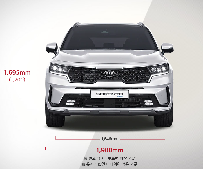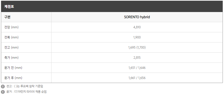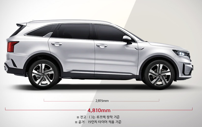 2020 쏘렌토 하이브리드 제원을 알아보도록 하겠습니다. 전장은 4,810으로 굉장히 넓습니다. 거의 패밀리카라도 해도 될 정도의 크기 입니다. 그리고 전폭은 1,900로 카니발 전폭 1,985와 크게 차이가 없는 것을 볼 수 있습니다.