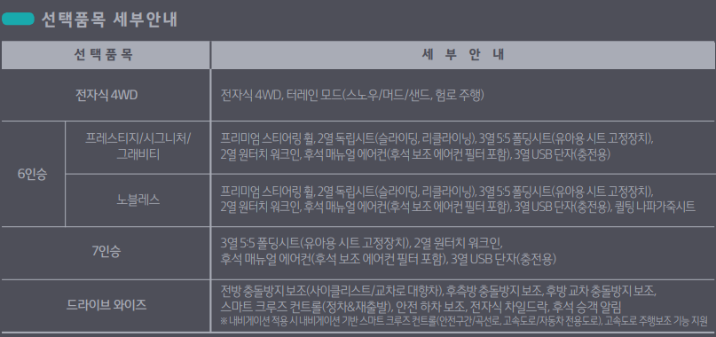 다음은 선택품목에 대한 세부안내 입니다. 6인승과 7인승으로 선택이 가능 합니다. 패밀카로 생각하시는 분들에게 추천 드리며, 안전성에 비중을 두고 계신 분들은 기본 트림에 드라이브와이즈를 추천 드립니다. 전방충돌방지, 스마트 크루즈 컨트롤 등 안전성을 위한 기능은 운전자의 안정성을 향상시키는 기능 입니다.