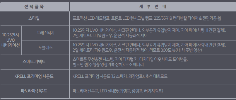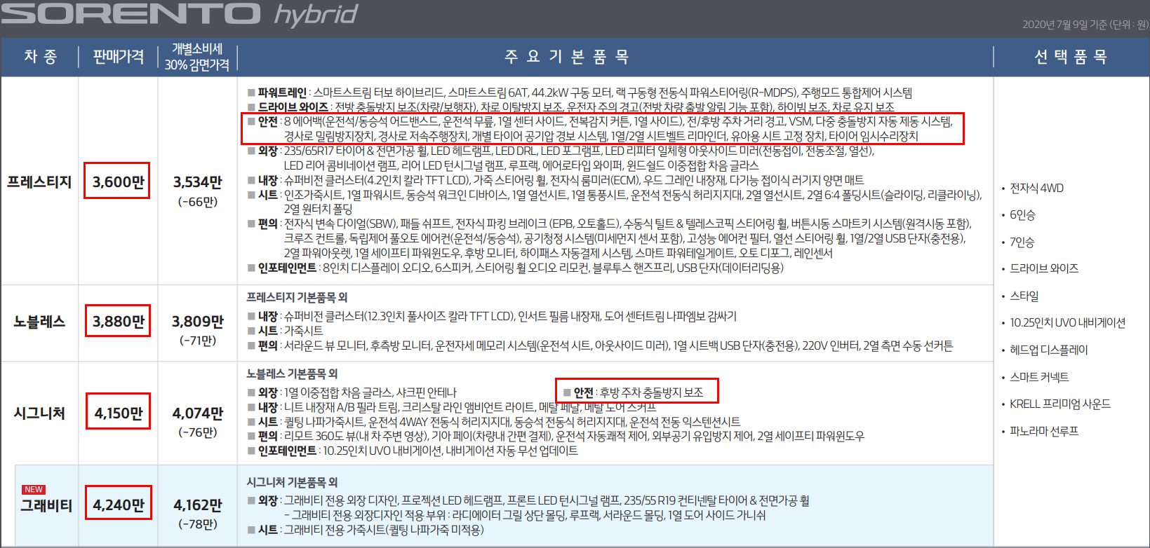 다음은 2020 쏘렌토 하이브리드 가격표 대해서 자세히 트림별로 자세히 알아보도록 하겠습니다. 트림은 프레스티지, 노블레스, 스그니처, 그레비티 총 4가지로 분류 됩니다.