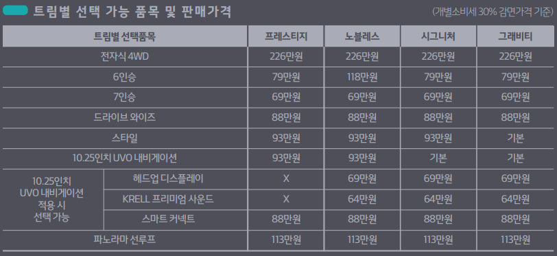 하단은 트림별 선택 가능 품목에 대한 판매 가격입니다. 기본 트림 가격에 선택하시려는 품목의 가격을 더하시면 총 차량 가격을 확인 가능 합니다.