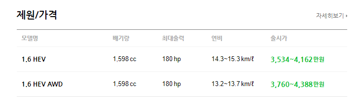 2020 쏘렌토 하이브리드는 모델이 2가지 입니다. 배기량은 약 1,600cc입니다. 모델별에 따라 연비 차이가 나며, 출시가도 약 1,000만원 가량 차이가 압니다.