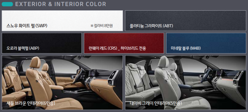 마지막으로 2020 쏘렌토 하이브리드 색상에 대해서 알아보도록 하겠습니다. 2020 쏘렌토는 총 5가지 색상으로 출시 되었습니다. 하지만 하이브리드는 런웨이 레드 색상만 선택이 가능 합니다.