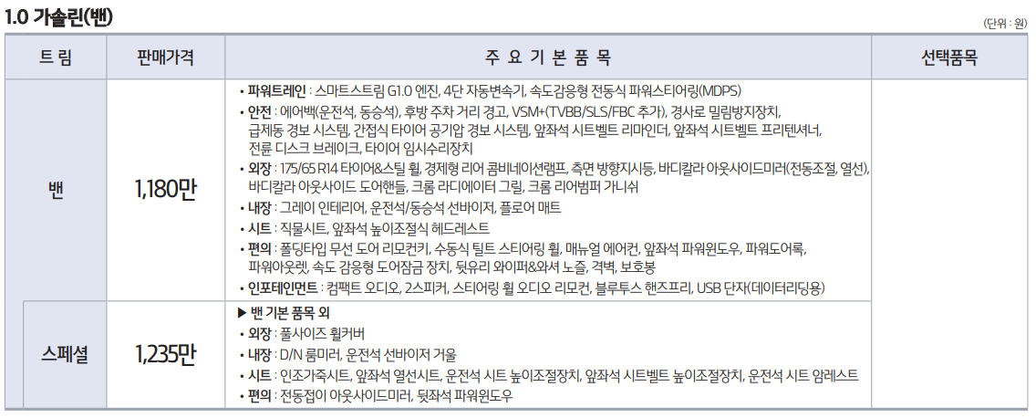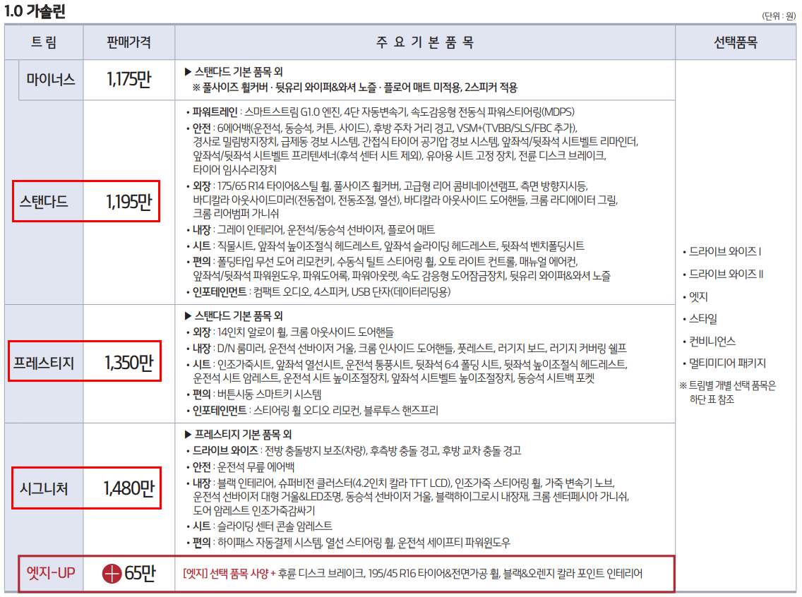 스탠다드 1,195만, 프레스티지 1,350만원, 시그니처 1,480만원 입니다. 트림의 업그레이드로 눈여결 볼 항목은 드라이브 와이즈 입니다. 전방 충돌방지 보조(차량), 후측방 충돌 경고, 교차 충돌 경고가 추가 됩니다. 운전자의 안전을 위한 고사양 옵션 입니다.