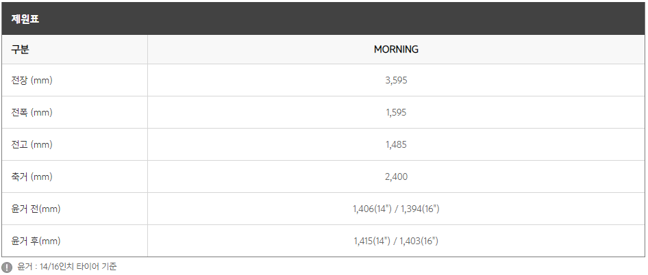 2021 모닝 어반은 출시가 1,175 ~ 1,480만원 입니다. 옵션에 따라 약 400만원의 차이가 납니다. 연비는 15.7로 굉장히 좋습니다. 연료는 가솔린만 제공 합니다. 하단에서는 모닝 어반의 간단한 제원에 대해서 알아보도록 하겠습니다.