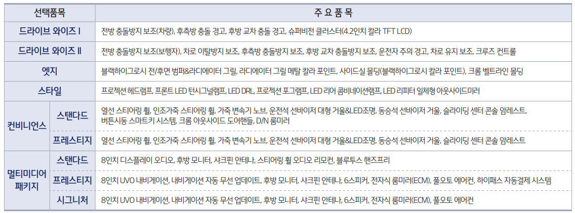 다음은 트림별 선택품목 가격표 대해서 알아보도록 하겠습니다. 개인적으로 추천드리는 선택 트림은 드라이브 와이즈 1,2 입니다. 안전성과 운전을 수월하게 하기 위한 고사양 기능입니다. 기본 스탠다드 트림에 드라이브 와이즈 옵션을 넣는 것도 가성비 있게 차량을 구매 하는 좋은 선택 입니다.