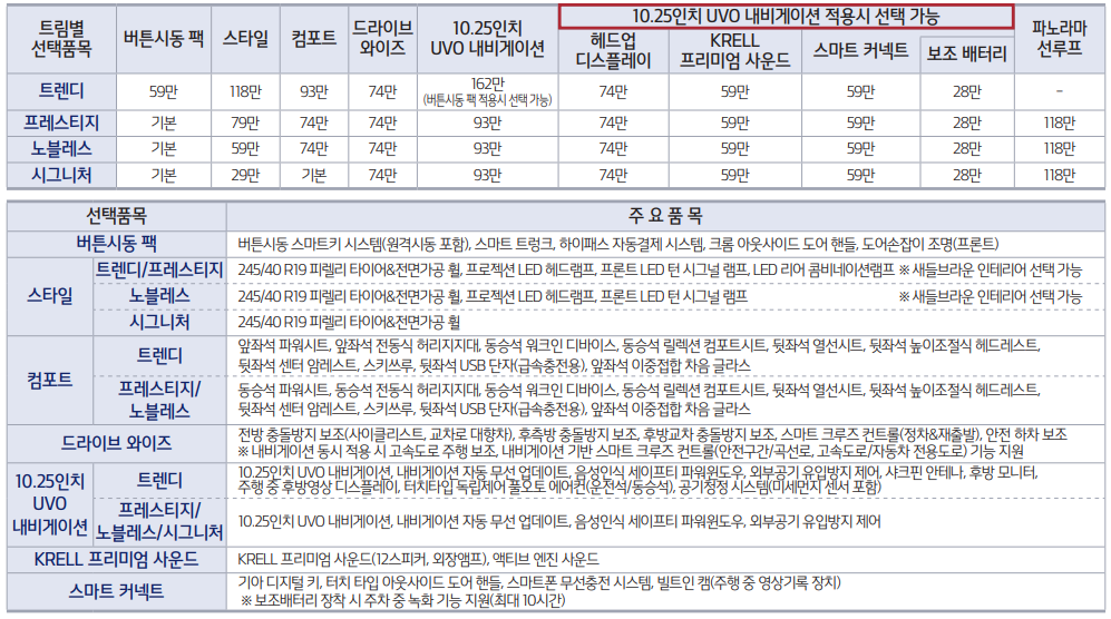 위의 이미지는 트림별 선택품목 가격표 및 주용 설명 입니다. 차량을 가성비있게 고르는 방법은 중 기본 트림에 선택 품목을 잘 추가 하시면 높은 사양의 트림의 성능을 뽑아내실 수 있습니다. 그래서 많은 자료를 보셔야 합니다. 개인적으로는 드라이브 와이즈와 스마트 커넥트를 추천 드리며, 자신이 원하는 스타일의 옵션을 잘 찾아서 조합해보시기 바랍니다.