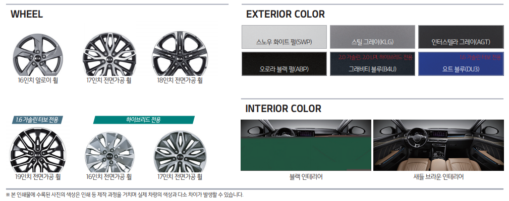 휠은 선택품목 트림으로 위의 이미지에서 확인 하시기 바랍니다. 색상은 스노우 화이트펄(8만원추가), 스틸 그레이, 인터스텔라 그레이, 오로라 블랙 펄, 그래비티 블루(2.0가솔린, 2.0 LPI 하이브리드 전용), 요트 블루(1.6 가솔린 터보 전용) 6가지 입니다. 내부 인테리어는 2가지로 선택이 가능합니다.